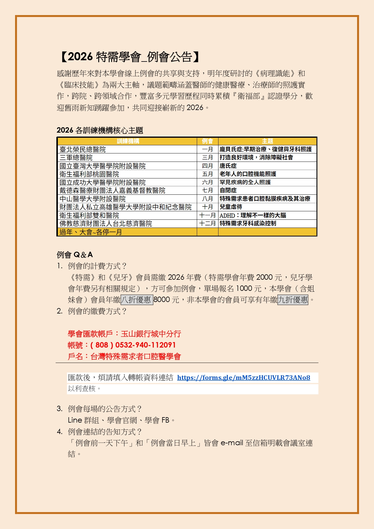 《特需》和《兒牙》會員需繳2026年費(特需學會年費2000元,兒牙學會年費另有相關規定),方可參加例會,單場報名1000元,本學會(含姐妹會)會員年繳八折優惠8000元,非本學會的會員可享有年繳九折優惠。