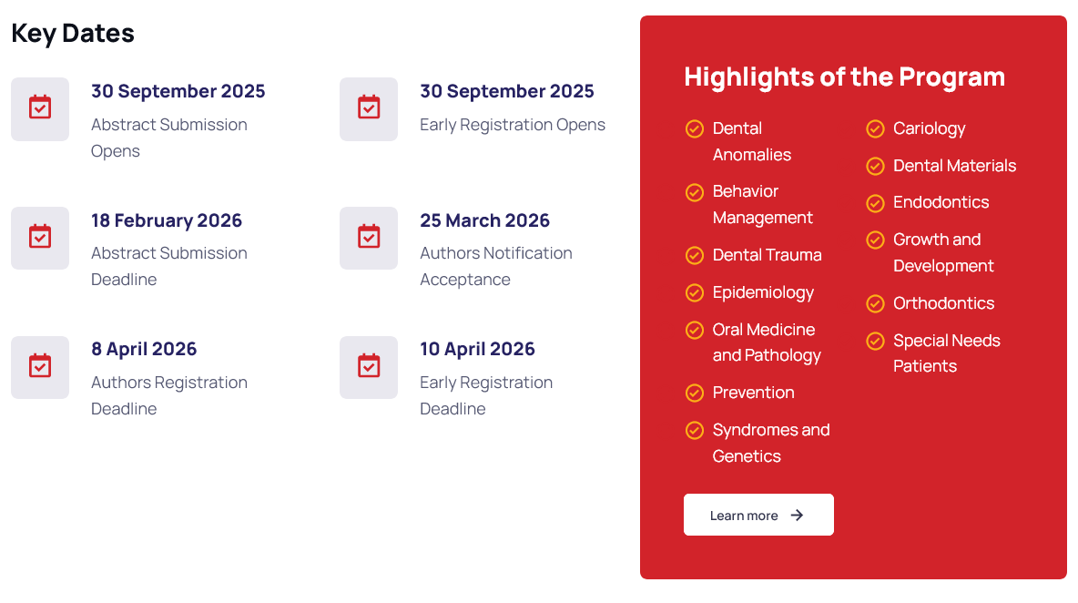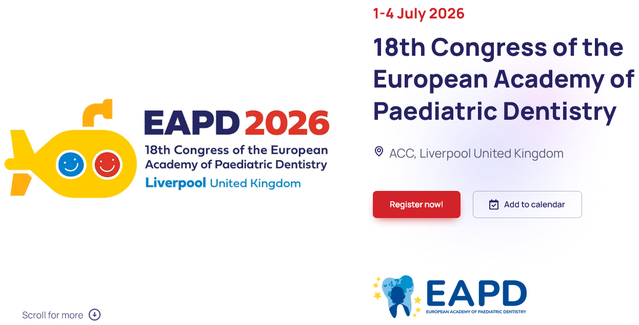 國際學術研討會 18th Congress of the European Academy of Paediatric Dentistry 2026/07/01 09:00 ~ 2026/07/04 15:00 ACC, Liverpool United Kingdom 主辦單位 European Academy of Paediatric Dentistry (EAPD) 活動收費 否 提供餐食 否 串連網址 http://www.eapdcongress.com/ 活動內容 聯絡資訊 電子信箱 info2026@eapdcongress.com 備註 For General Inquries For further information you may contact the PCO of the Symposium, CONVIN S.A. info2026@eapdcongress.com 活動清單